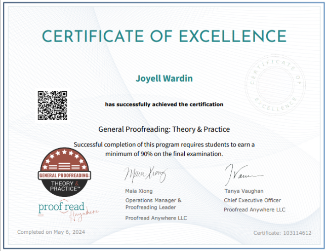 My proofreading expertise is backed by Proofread Anywhere’s rigorous certification program, where I completed 40+ practice essays and earned a perfect 100% on the final exam. I specialize in ensuring clarity, consistency, and correctness in all types of written content, while preserving the original voice and intent.